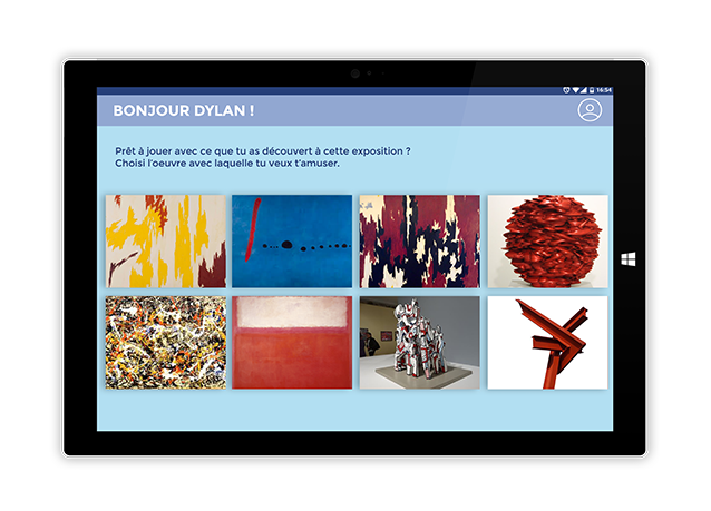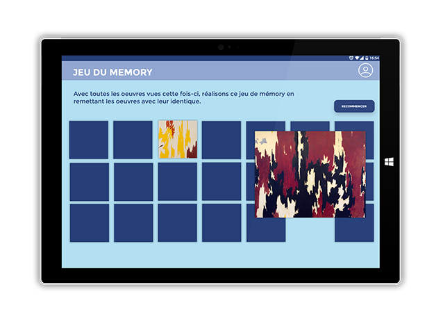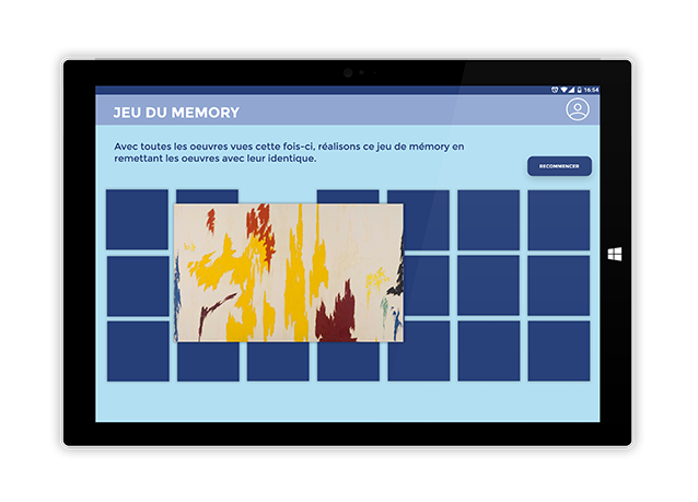Ce concept s’articule sur l’après visite, récupération de son ticket pour débloquer un autre contenu sur les oeuvres de chez soi. L’apprentissage se continue à l’aide de mini-jeux simples qui font appel à la mémoire de l’enfant: mémory, puzzle, 7 erreurs (sur deux oeuvres possédants le même sujet par exemple), énigmes etc. Il peut également accéder à un contenu plus éducatif, animés ou non, avec des informations complémentaires ou des oeuvres connexes, ressemblantes, ou de la même époque sur le même sujet. Entretenir sa découverte et l’envie d’expérimenter avec d’autres supports et de repartir à l’exploration des contenus muséographiques.