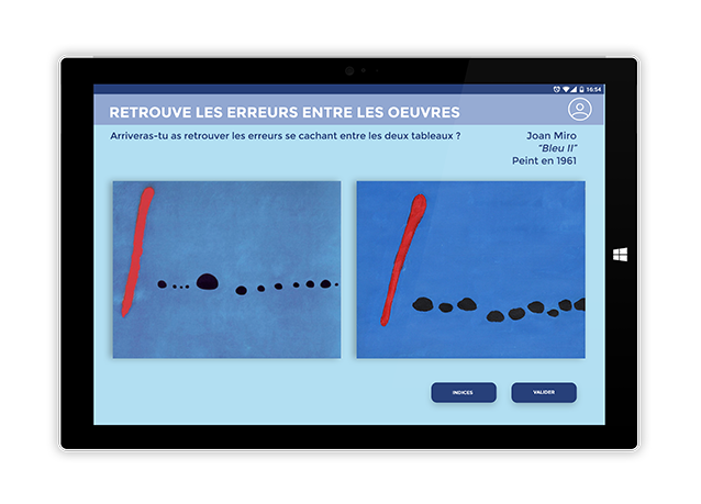 Un mini-jeu par oeuvre lui est alors proposé, en plus d'informations. Ici un jeu des 7 erreurs sur un tableau de Miró