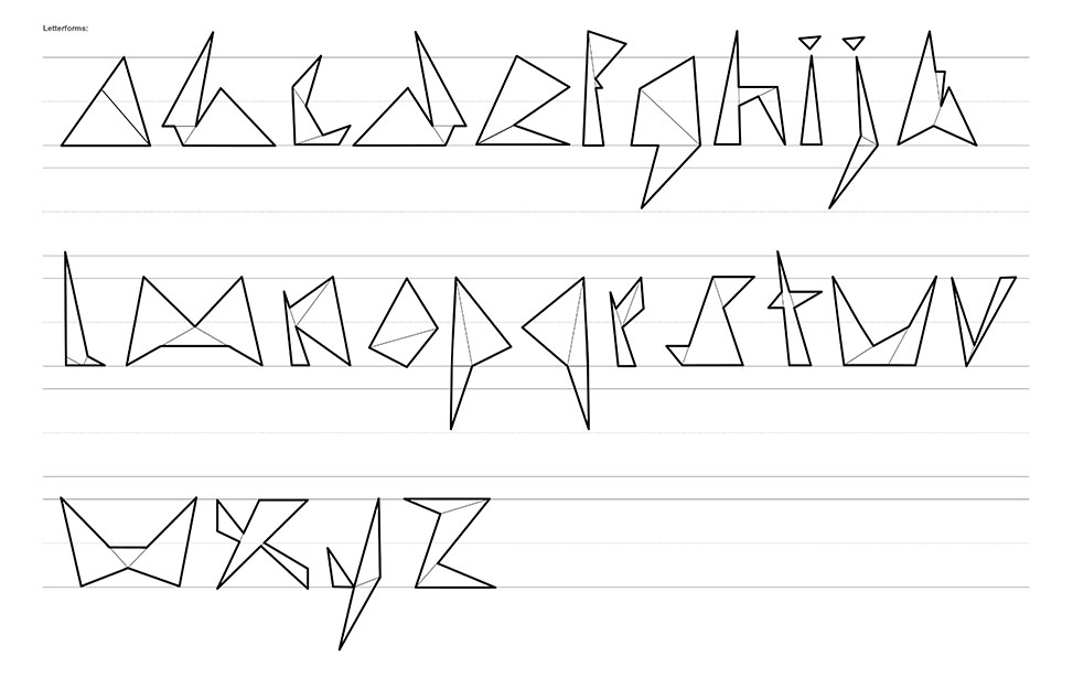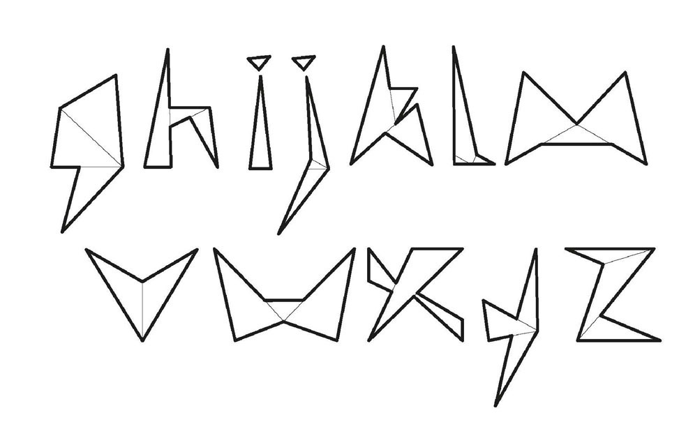 My concept is to have two different lines, extern ones bolder than the intern ones. I only use triangles to make every letters of my alphabet. The Louvre's Pyramid was my principal inspiration.